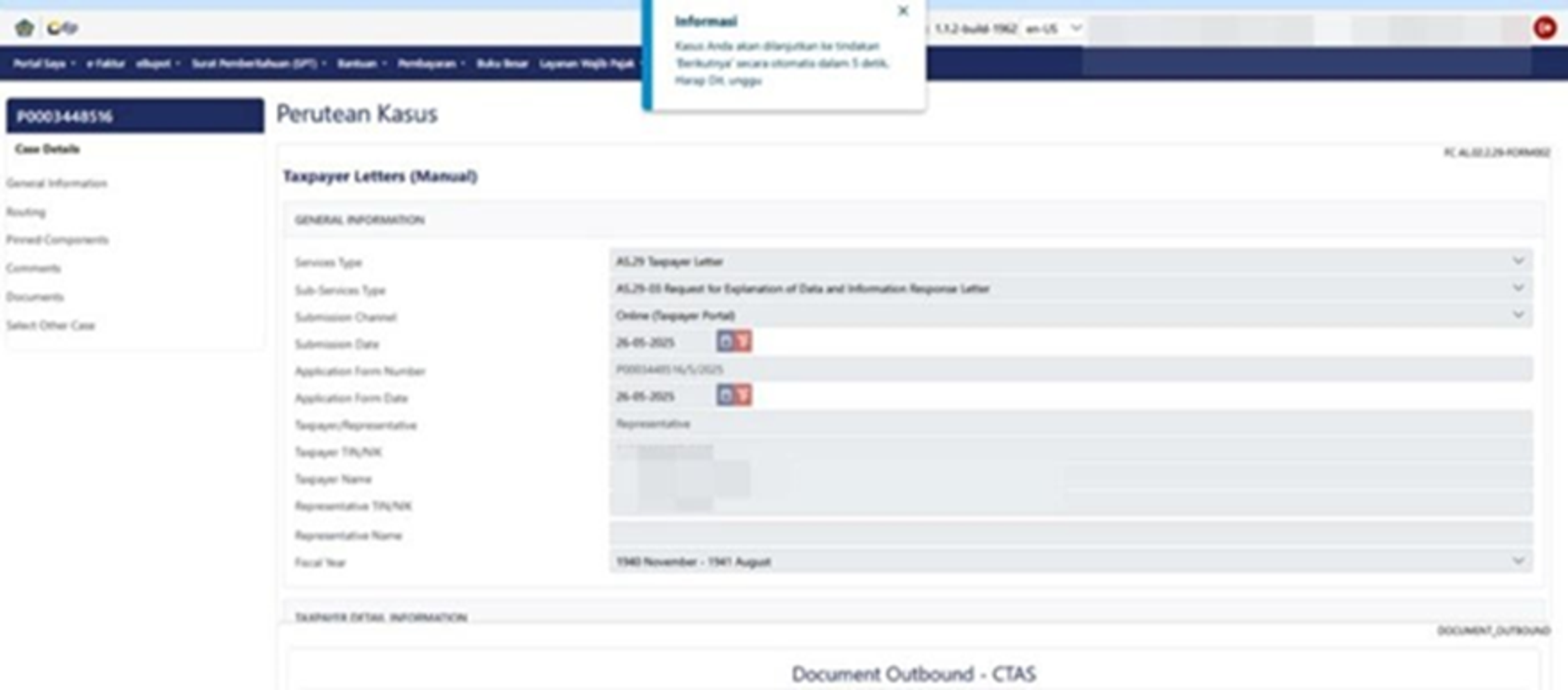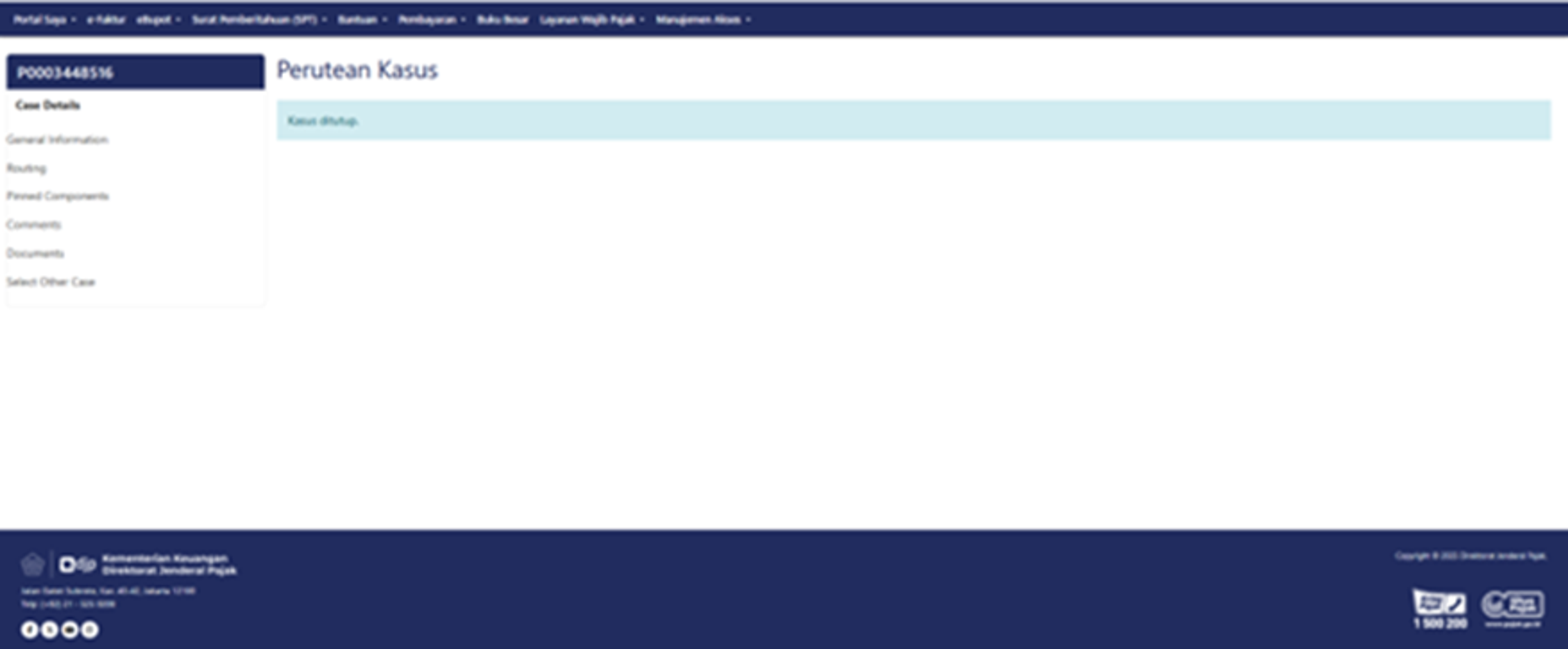 Akan muncul Notifikasi Informasi “Kasus Anda akan dilanjutkan ke tindakan berikutnya...” yang akan hilang begitu saja dan akan berganti dengan notifikasi alur kasus “Kasus Ditutup”