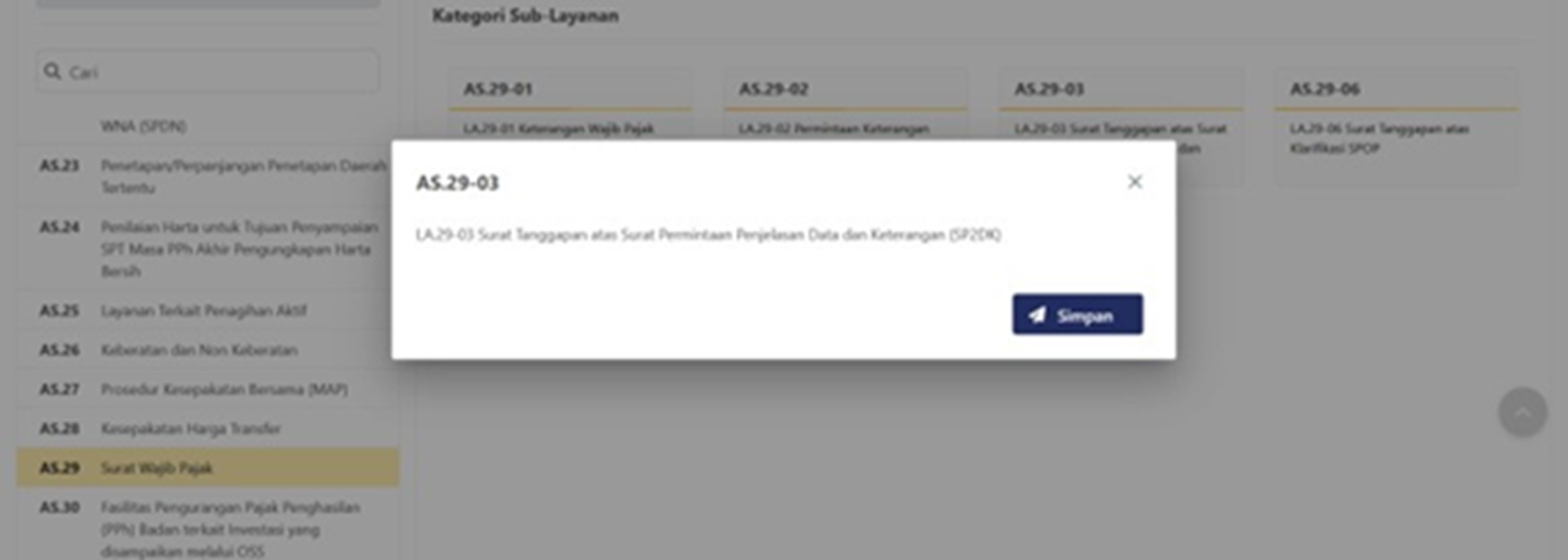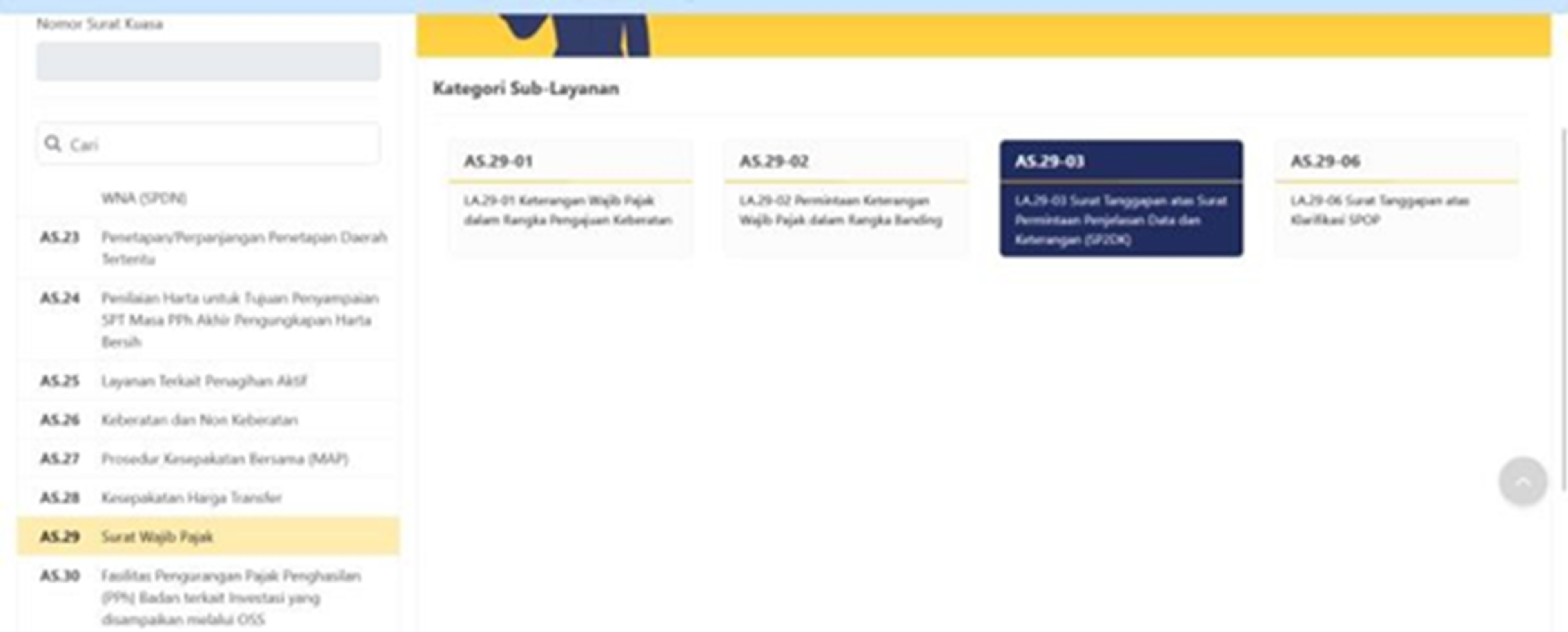 Cari AS.29 atau ketikkan “Surat Wajib Pajak” untuk memudahkan pencarian, lalu Pilih AS.29-03 “Surat Tanggapan atas Surat Permintaan Penjelasan Data Dan Keterangan (SP2DK)
