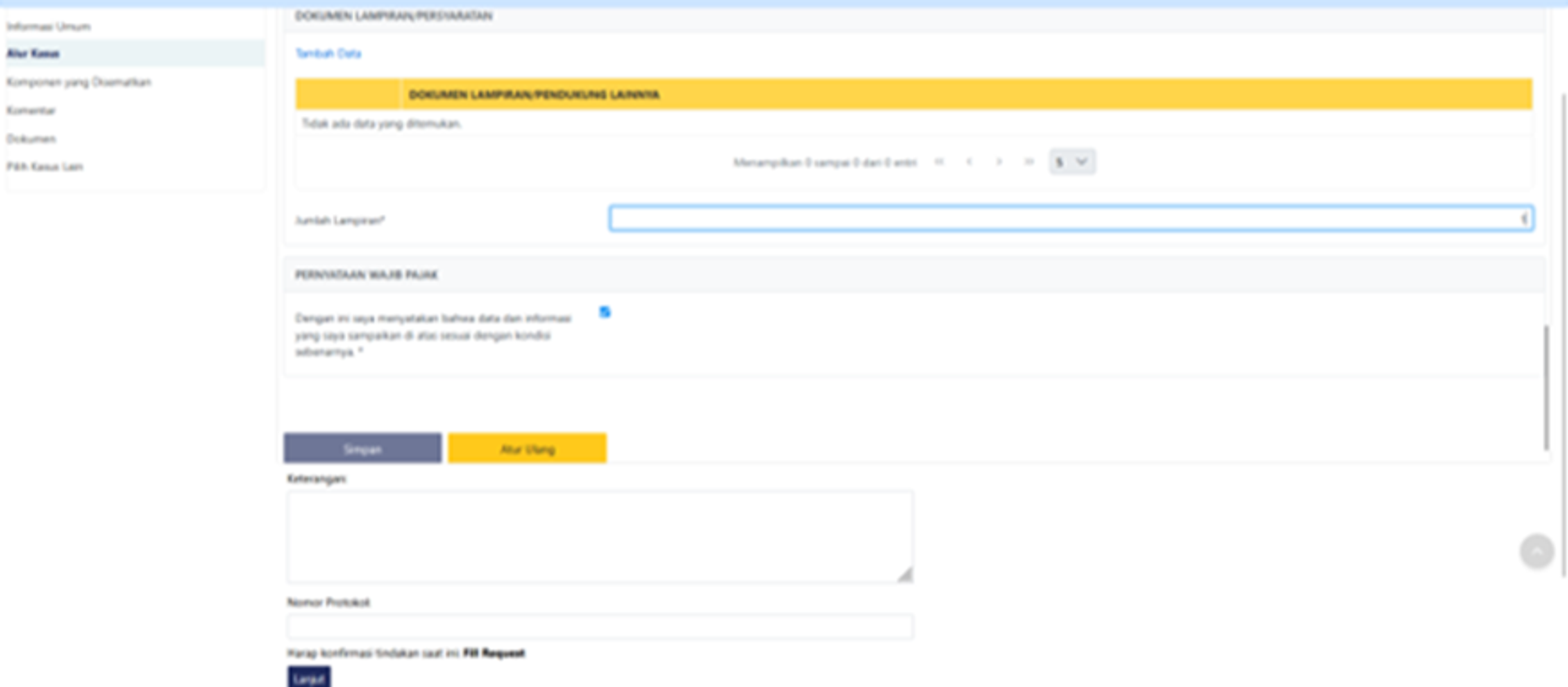 Silahkan mengisi “Jumlah Lampiran(*)” sesuai jumlah dokumen yang di unggah, centang box “Pernyataan Wajib Pajak”, lalu klik “Simpan”, jika sudah ada notifikasi penyimpanan sukses, maka silahkan klik “Lanjut”.