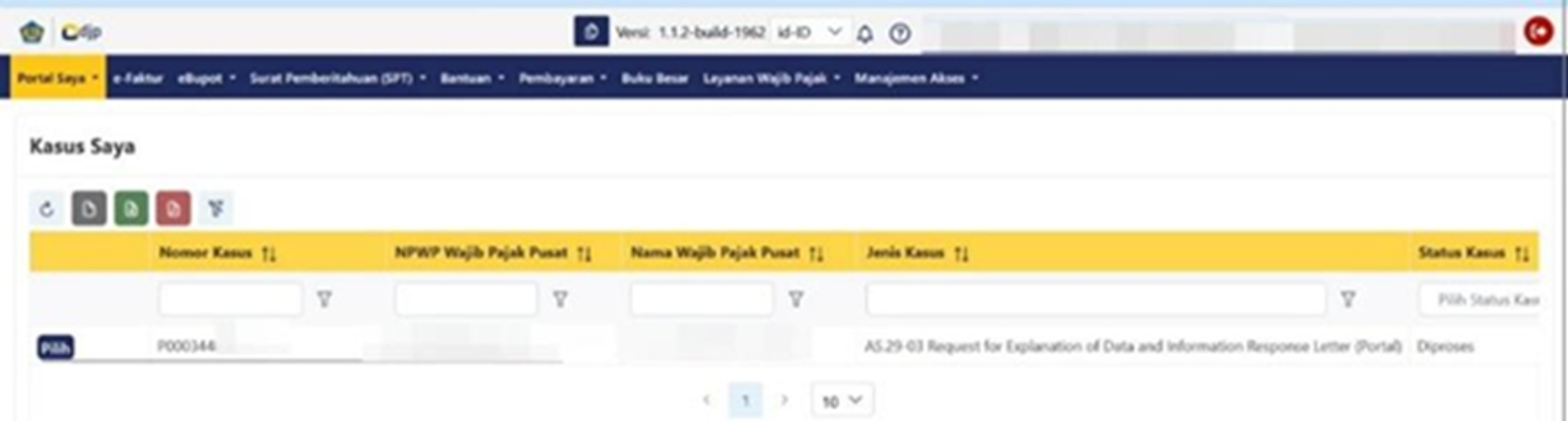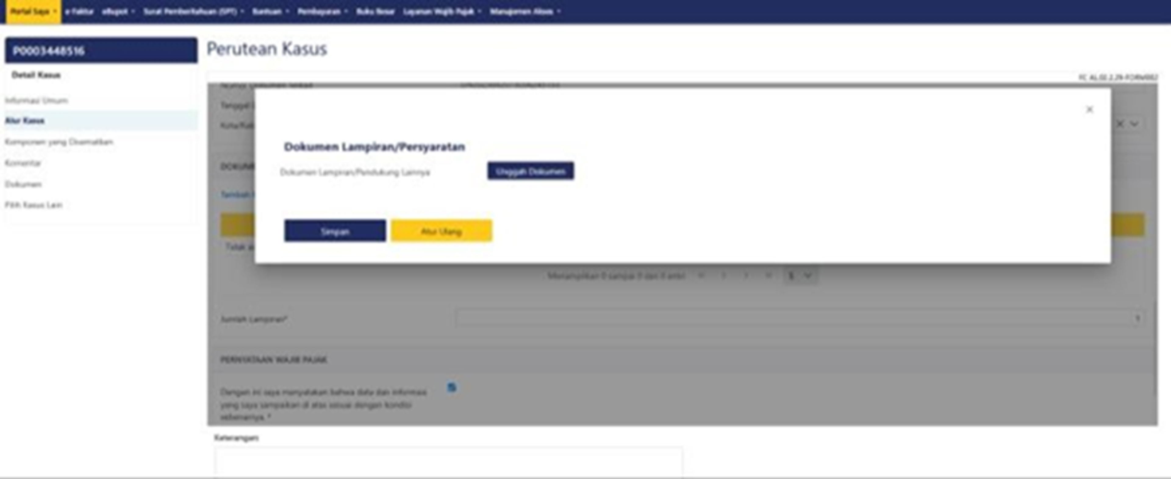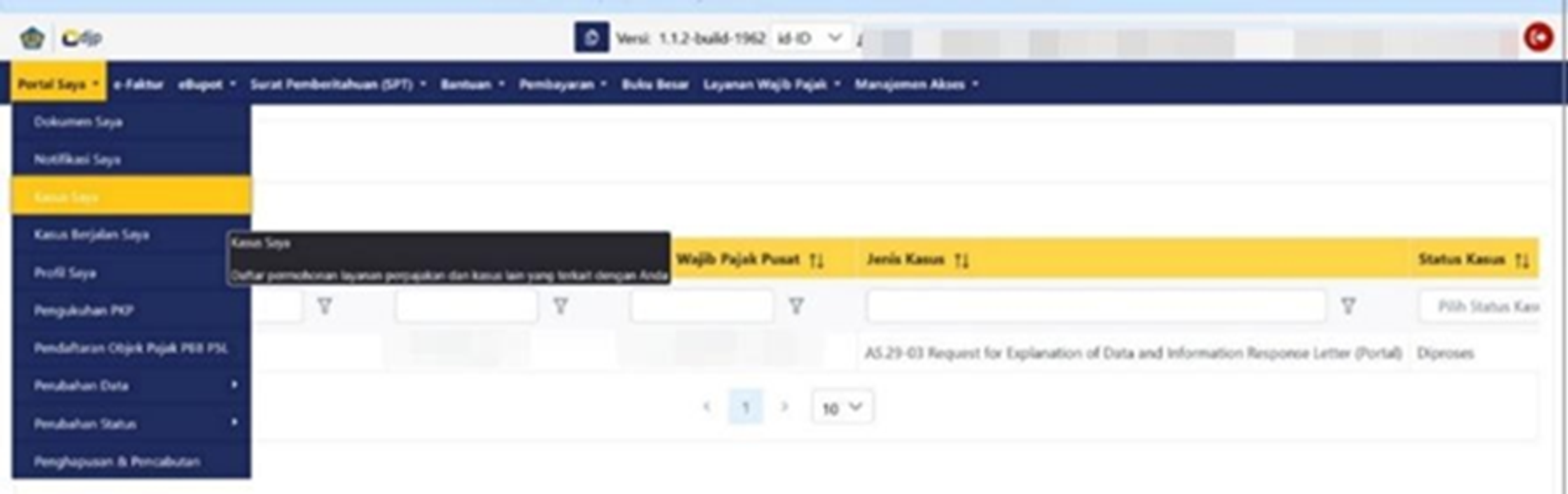 Klik Menu Utama “Portal Saya” lalu pilih sub-menu “Kasus Saya”, bila tidak muncul apapun, silahkan klik icon refresh untuk memunculkan