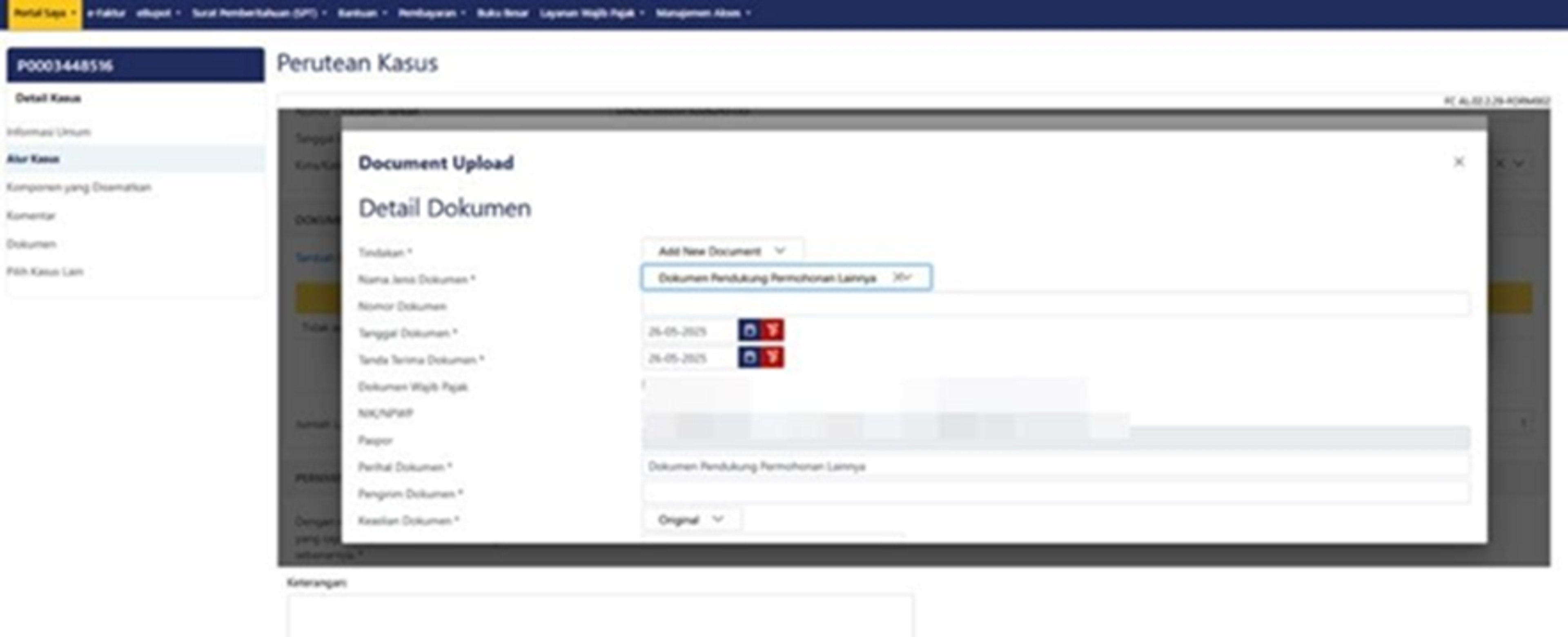 Untuk “Nama Jenis Dokumen”, dapat memilih “Dokumen Pendukung Permohonan Lainnya” atau memilih keterangan lain yang mendukung jawaban/tanggapan atas SP2DK