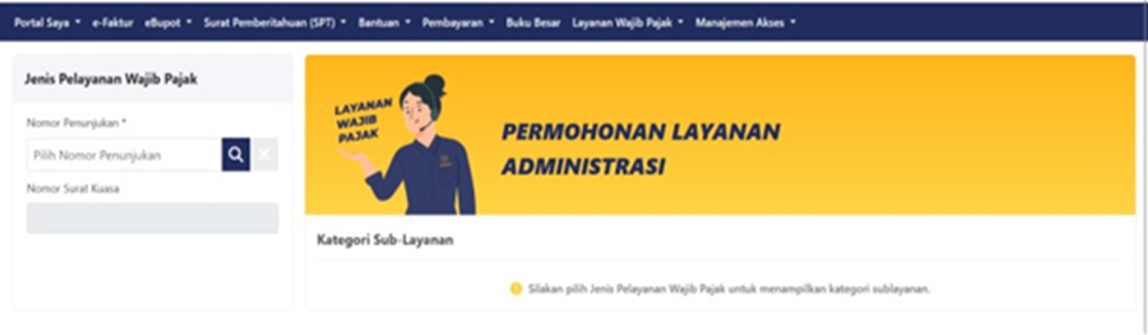 Klik menu Layanan Wajib Pajak → Layanan Administrasi → Buat Permohonan Layanan Administrasi.