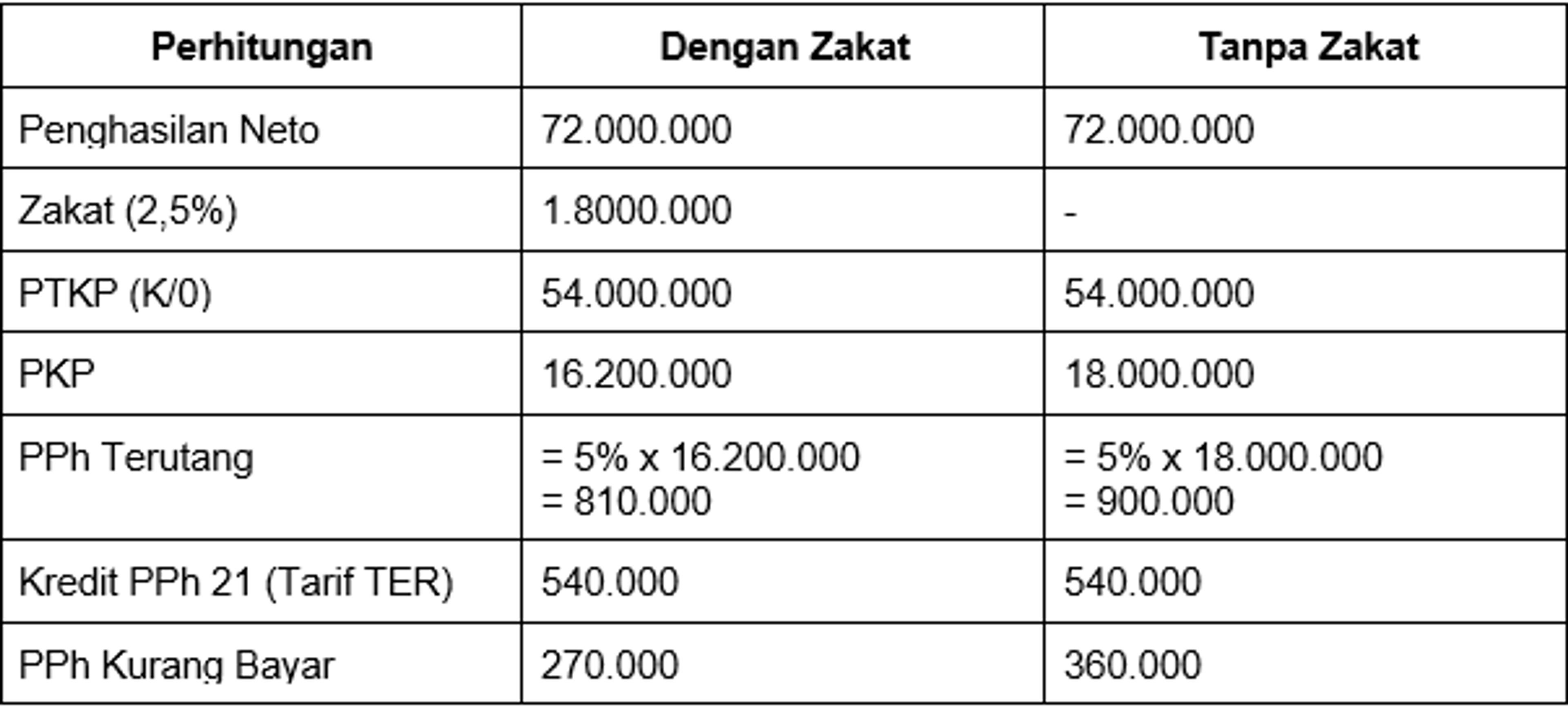 Tahun 2024 Sarah (TK/0) memperoleh penghasilan neto dari pekerjaannya sebagai marketing sebesar Rp72.000.000. Sarah membayar zakat sebesar 2,5% dari penghasilan netonya melalui BAZNAS dan telah mendapat bukti pembayaran. Atas fee yang diterima, telah dipotong PPh 21 sebesar Rp540.000. Perhitungan pajak pada akhir tahun ada pada gambar tabel diatas.